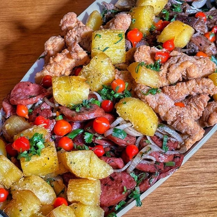 Arroz, fritas, queijo coalho, farofa e vinagrete _ _#Torresmo #Salgadinho #Picanha #porções #Filémignon #pratosespecias #Bacalhau #feijoada #carnes #caldos #saladas #panquecas #lanches #bebidas #delivery #