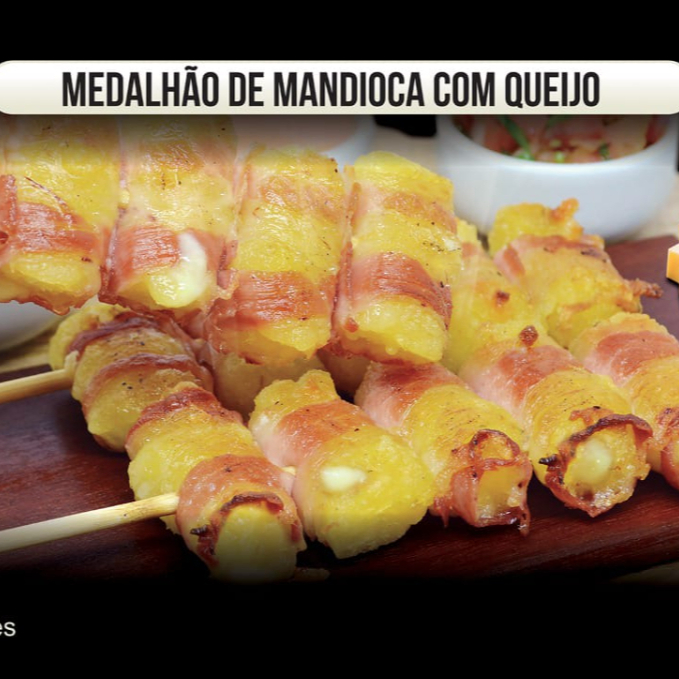 Espetinho mandioca com quatro queijo e bacon