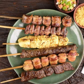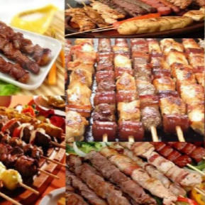 2 espetos carnes , 1 espeto linguiça , 1 espeto coração 1 espeto frango