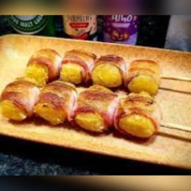 Mandioca recheada com queijo envolvida em uma fatia de bacon. Simples e maravilhoso.