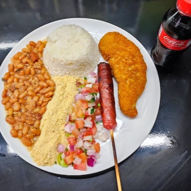 Prato de Arroz e Feijão Caseiros, Vinagrete c/ cebola roxa, Farofa e 1 espeto de Linguiça Toscana.