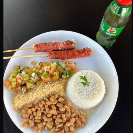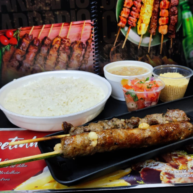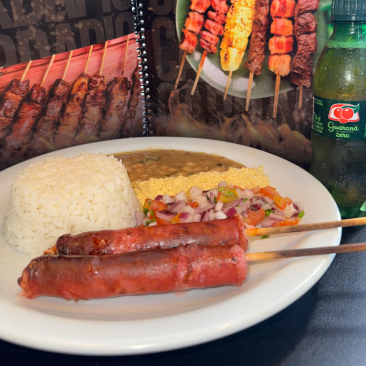 Refeição com Arroz, Feijão, Farofa, Vinagrete e 2 espetos de Linguiças da Casa. Disponível em 3 sabores!