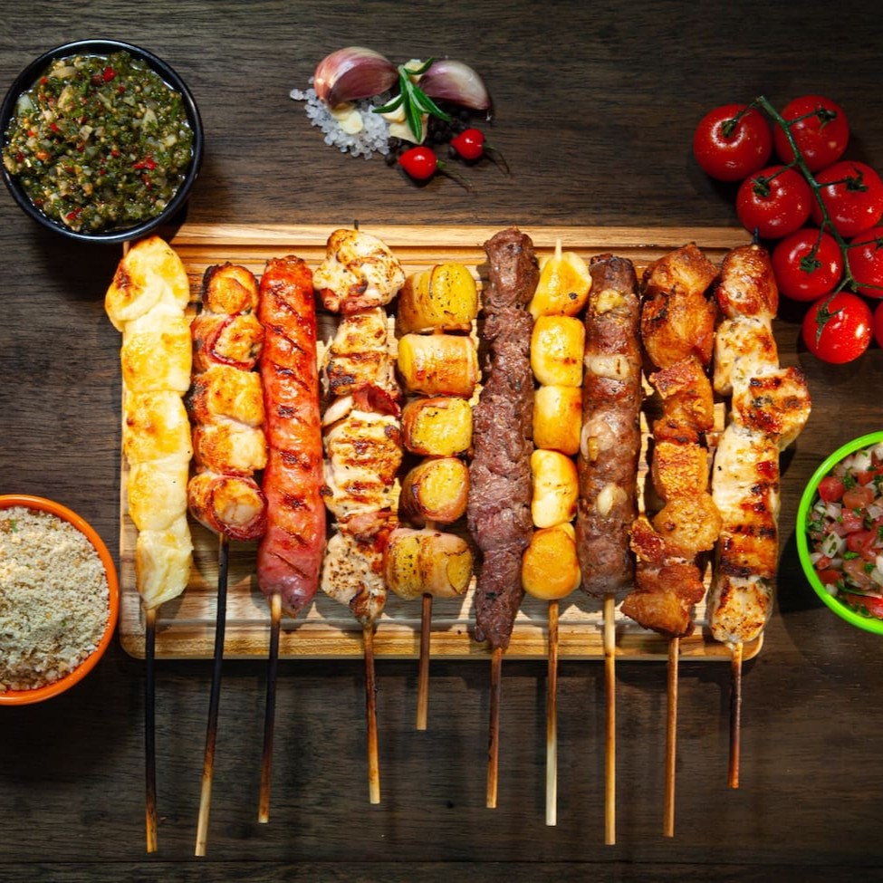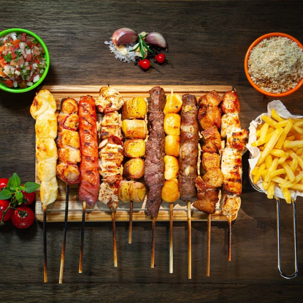 Combo com 8 espetos à sua escolha. Leve até 4 Guarnições com um desconto Especial e Pão de Alho por apenas R$ 9,99!