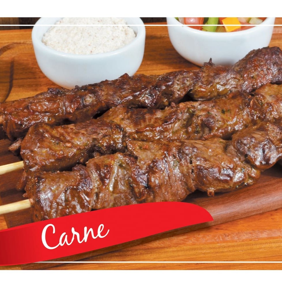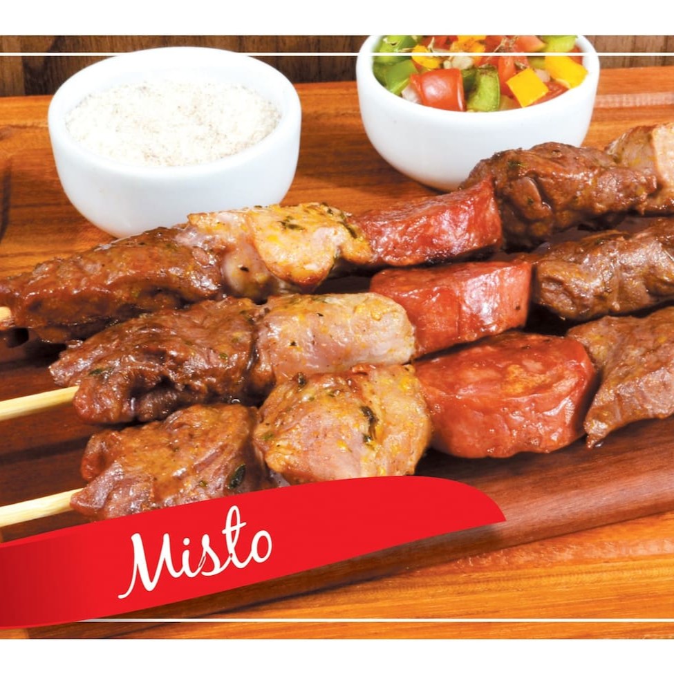 Espeto com três tipos de carne: Bovino (Lombinho) Suíno (Copa Lombo) Suíno calabresa Além de delicioso, proporciona diferentes sabores em um único espeto.