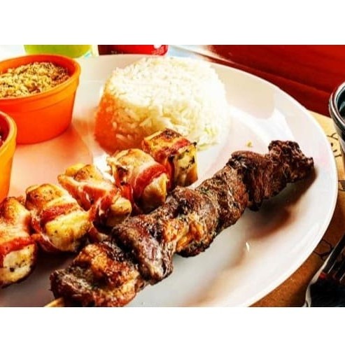 Refeição completa com espeto de carne e frango, arroz soltinho, feijão, farofa crocante e vinagrete da casa.