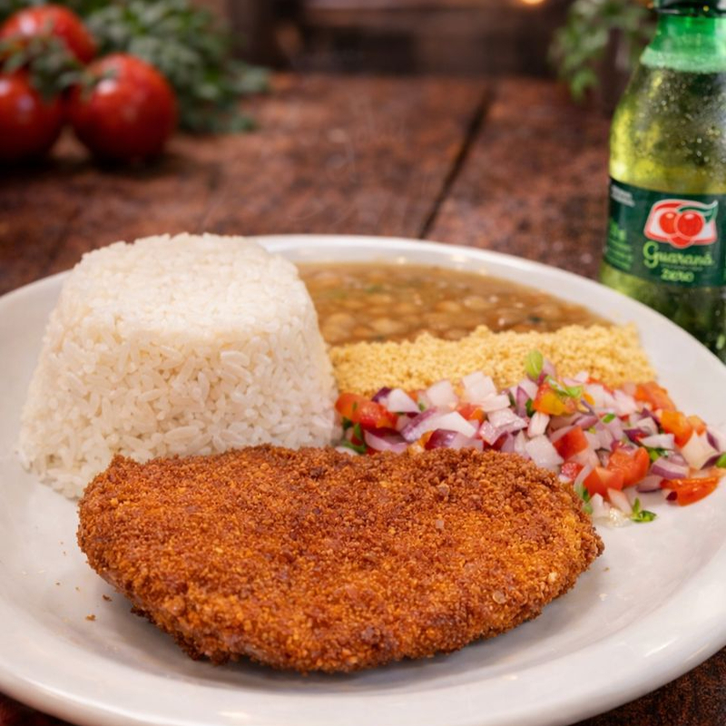 1 file de Frango Suculento + Linguiça Especial Da Casa + Arroz, Farofa, Vinagrete E Guarana 200ml . O Combo Completo!
