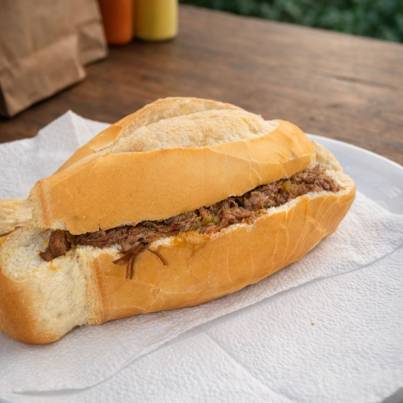 Delicioso Pão Francês com Carne Louca desfiada, feita de Acém bovino bem temperadinho com nosso molho de tomate caseiro e pimentões amarelo e vermelho, quem experimenta se Apaixona ! (200g)