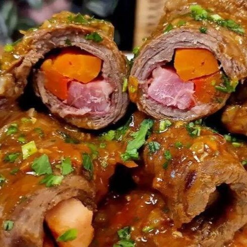Cenoura, calabresa, bacon, pimentão, cebola envolto no baby bife ao molho sugo