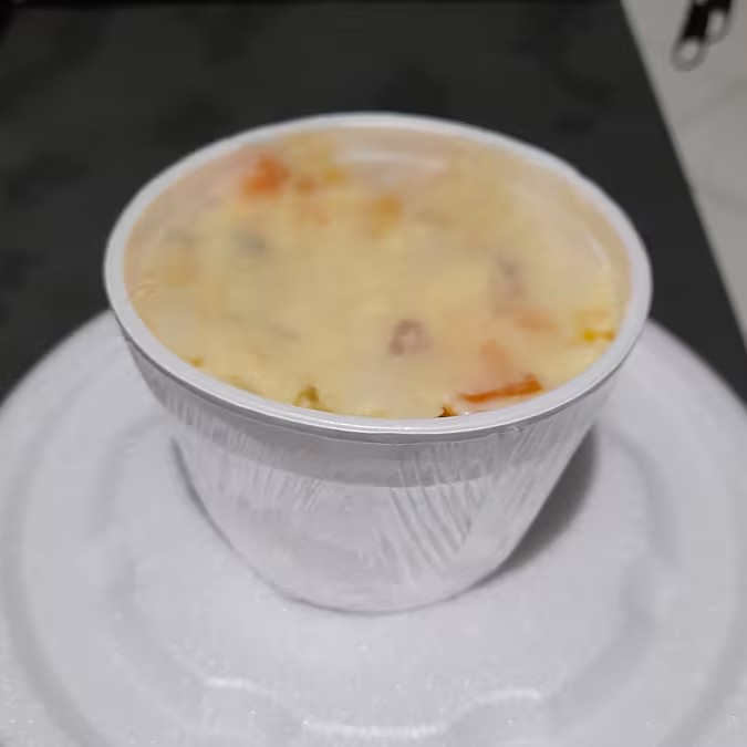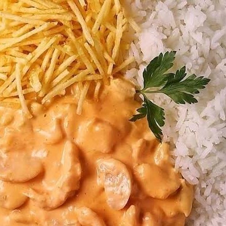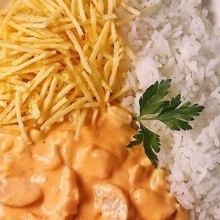 Acompanha: Arroz strogonoff de frango e batata palha.