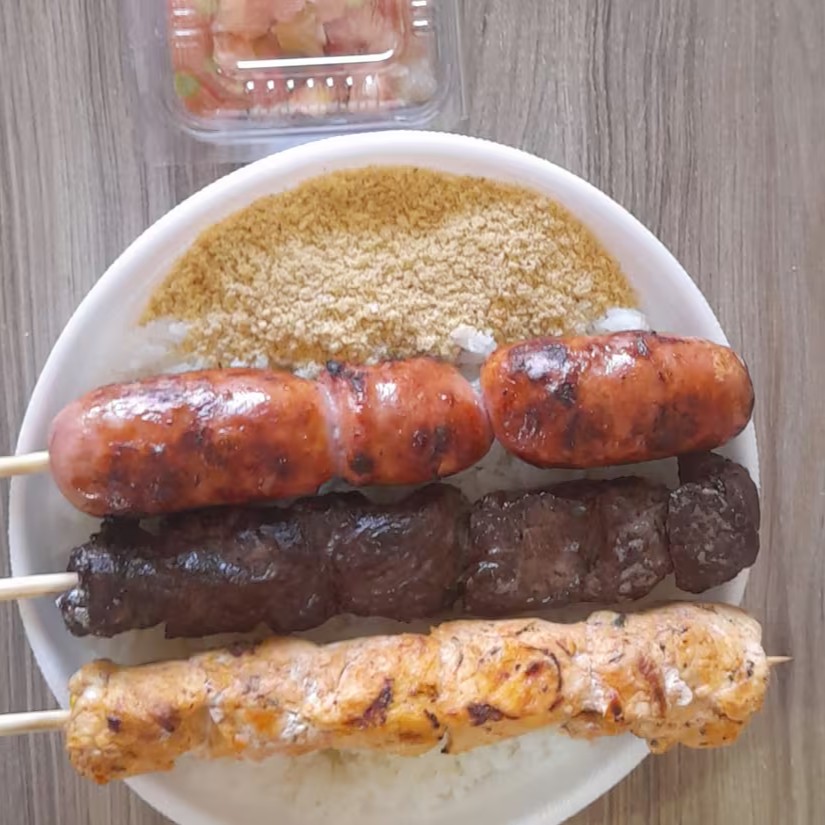 Acompanha: Arroz, vinagrete, farofa mais 3 espetos de sua preferência.