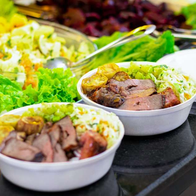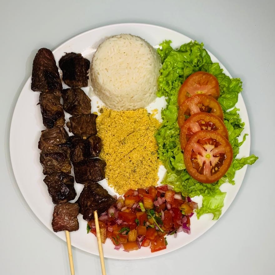 Delicioso churrasco de carne, acompanha arroz branco, farofa especial da casa, salada com molho especial da casa e delicioso vinagrete.