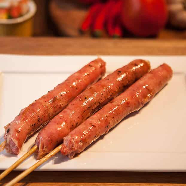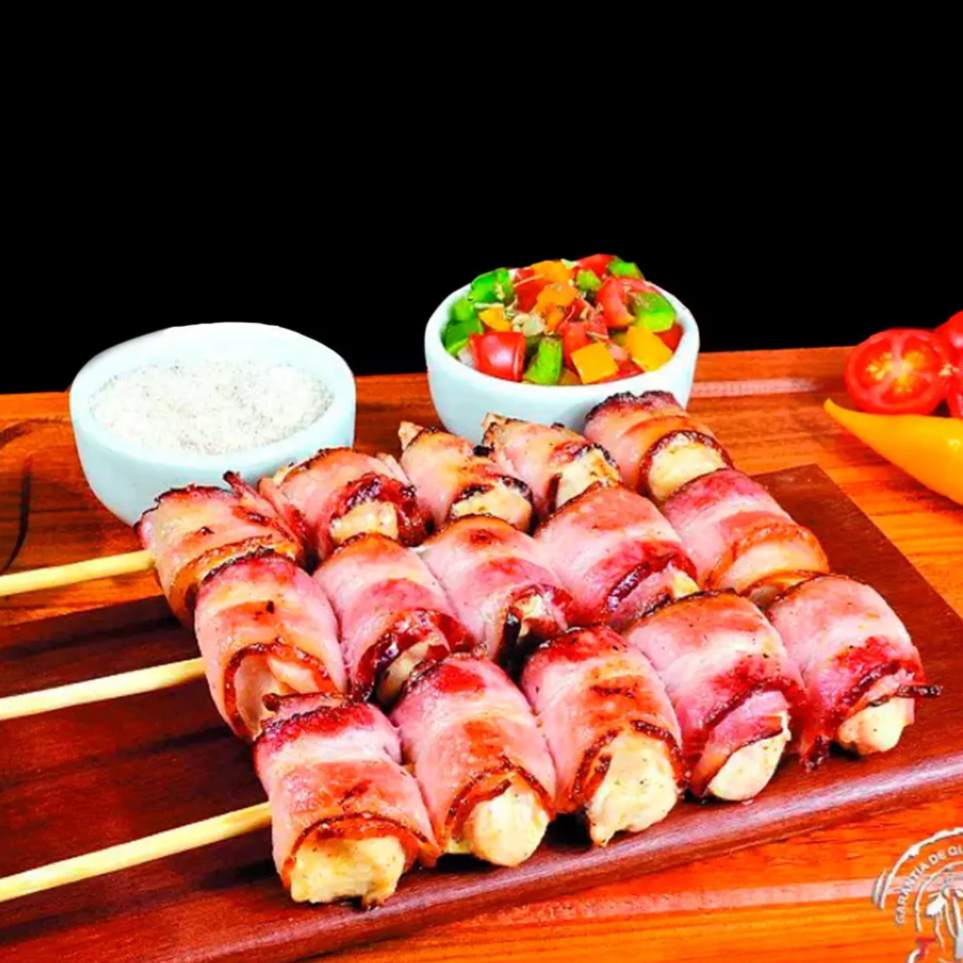 2 espetos de carne, 2 espetos de linguiça, 2 espetos de frango