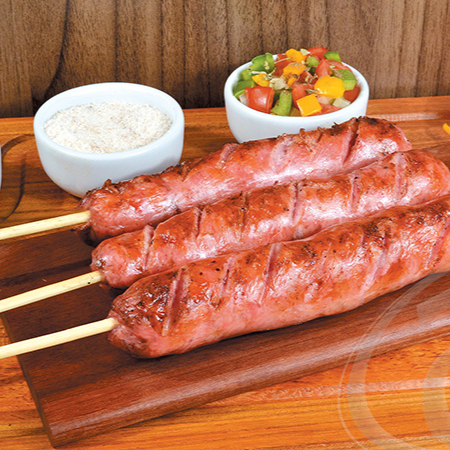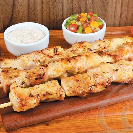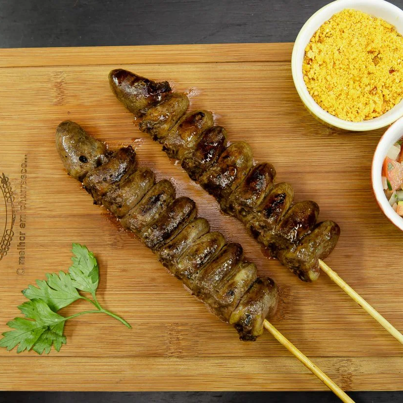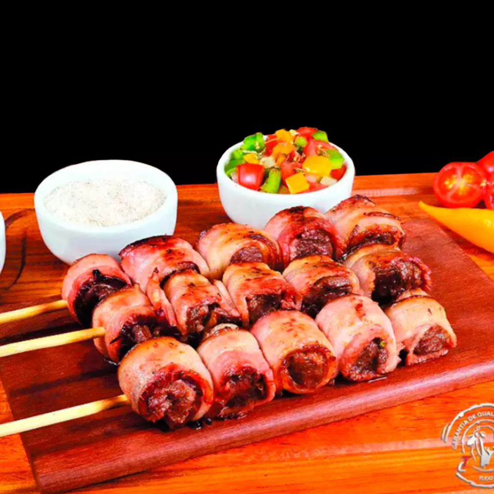 15 espetos sortidos (carne, frango, kafta, coração, linguiça) + 1 pão de alho + vinagrete + farofa + refrigerante 1L
