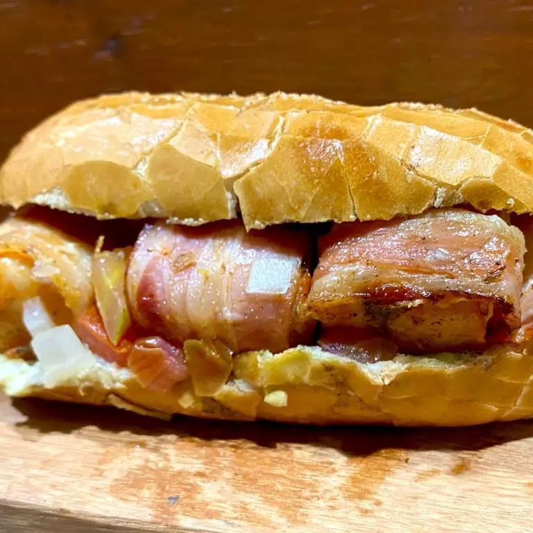 Maravilhoso lanche com linguiça, acompanhada de maionese especial e vinagretevinagrete