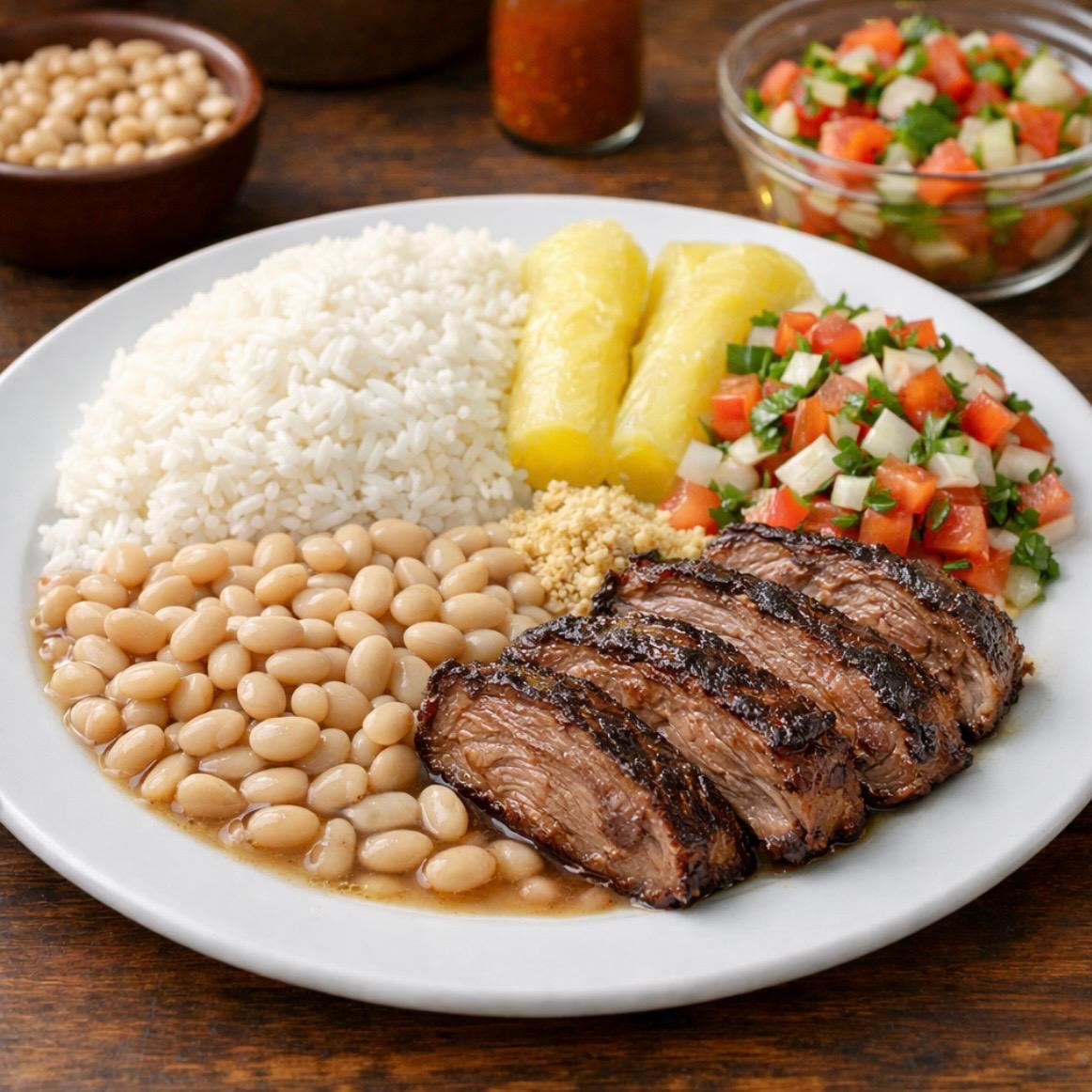 Arroz, feijão, mandioca e vinagrete.