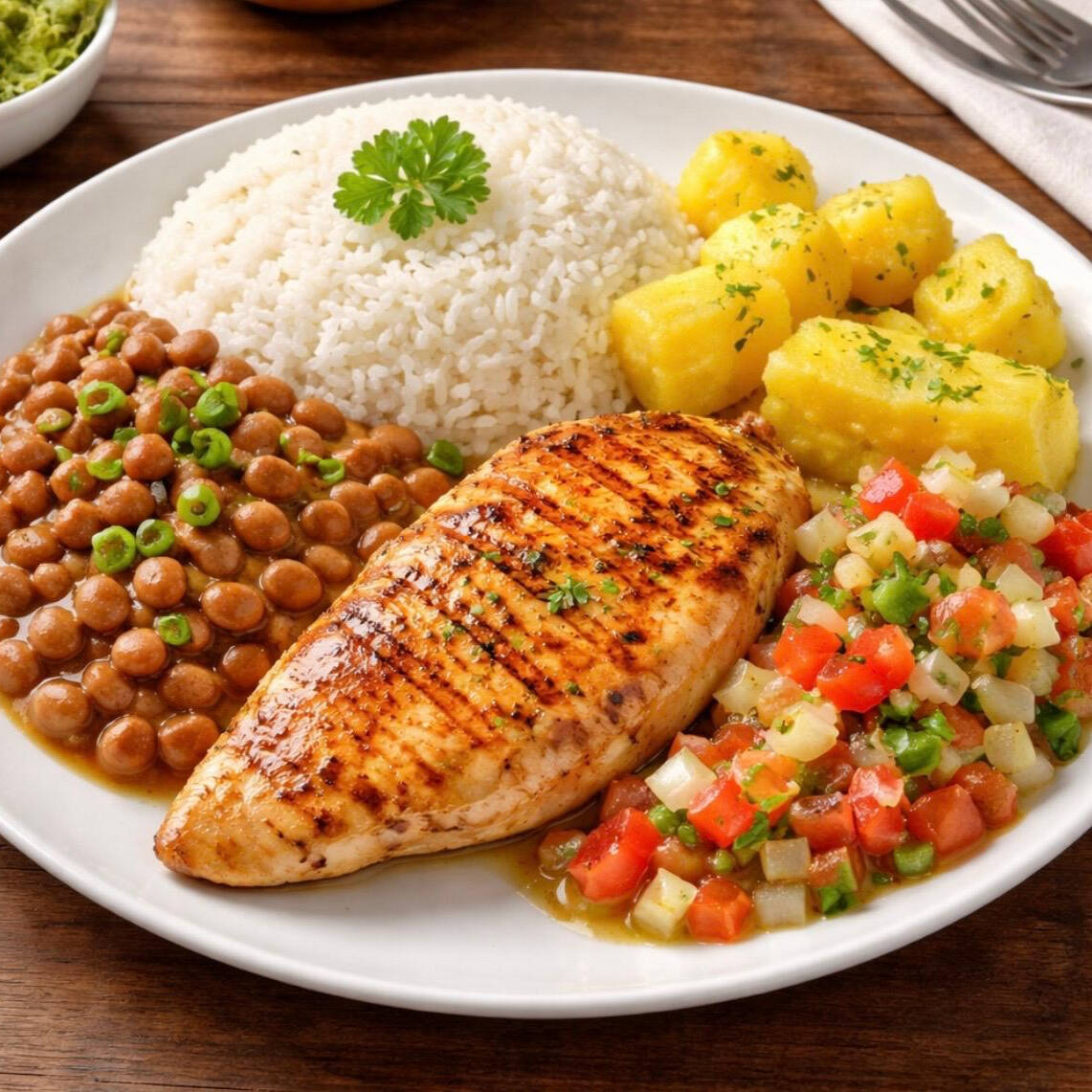Arroz, feijão, vinagrete e bife frango