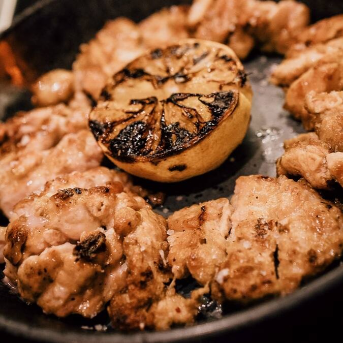 Mollejas (glândula timo) grelhadas na parrilla e finalizadas com limão siciliano queimado. Sabor autêntico e sofisticado.