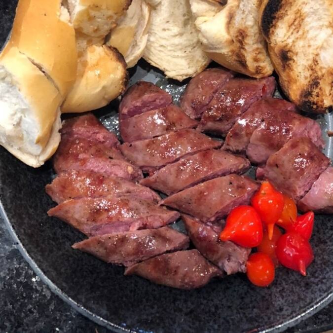 Linguiça bovina Black Angus recheada com pimenta biquinho, sabor suave e levemente adocicado. Uma combinação especial.