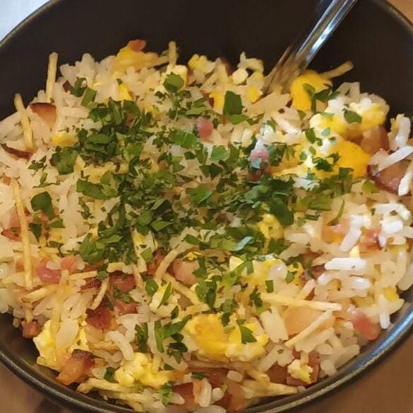 Arroz biro-biro preparado com ovos, bacon crocante, batata palha e salsinha. Clássico e saboroso.