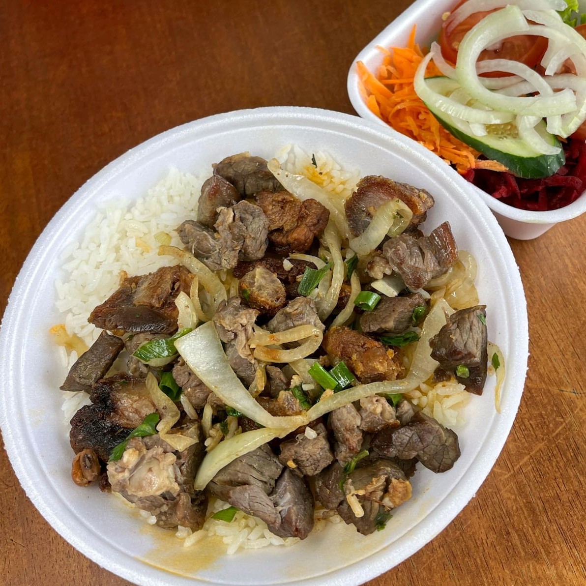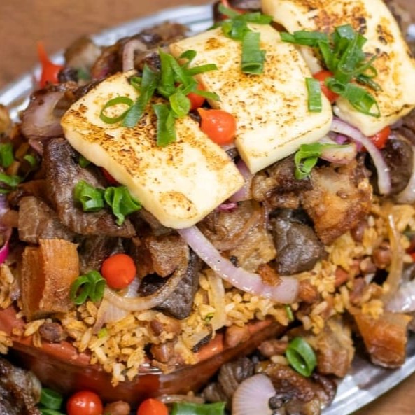 arroz e feijao de corda cobertos por cubos de carne de sol refolgados com queijo coalho torresmo e cebola