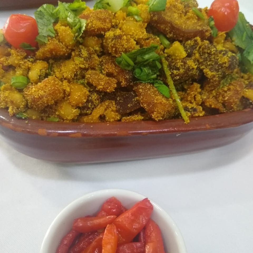 Feijão de corda refogado com pedacinhos de calabresa,bacon e torresmo e carne de sol misturados na farinha de mandioca. ...acompanha arroz.