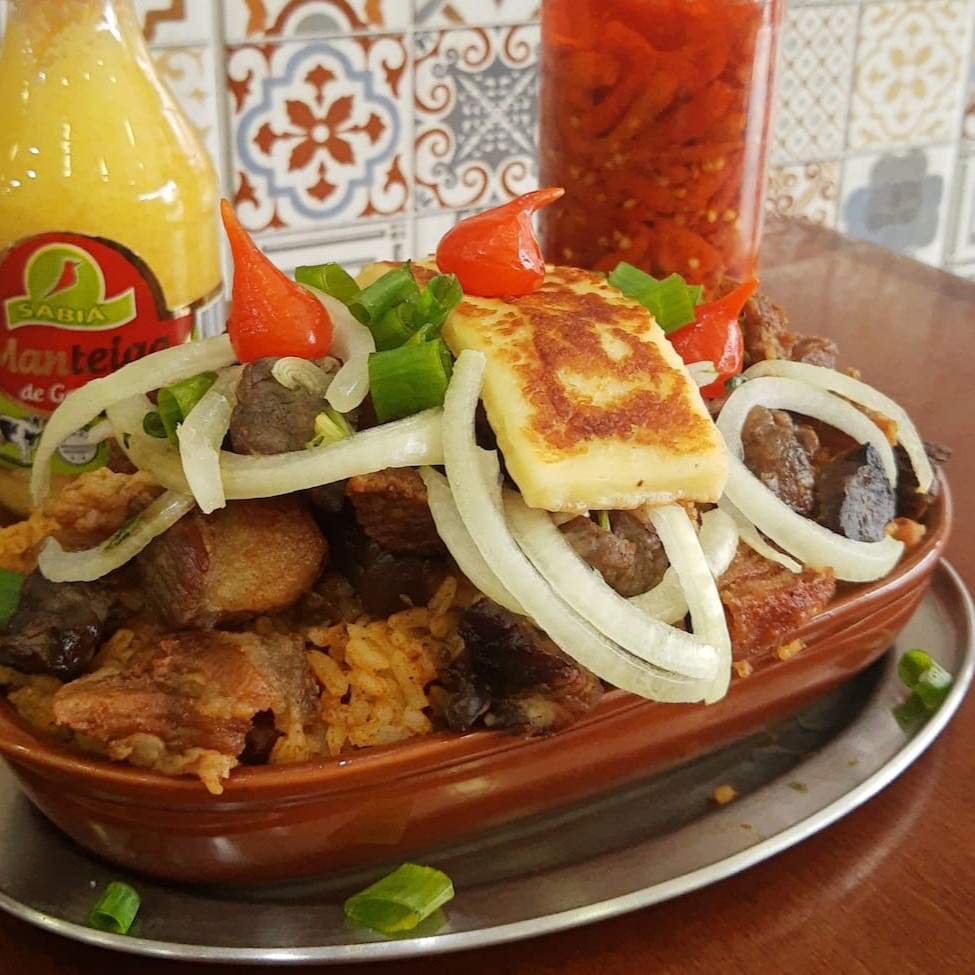 Arroz e feijão de corda, cobertos por cubos de carne de sol refogada, torresmo, cebola e queijo qualho.