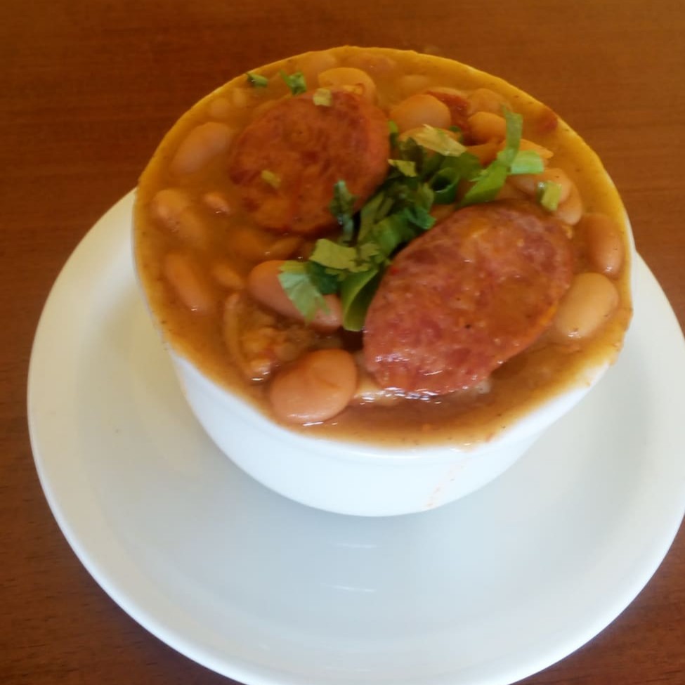 Fava branca cozida com costelinha e pés suino, jabá e linguiça calabresa, acompanha uma porção de arroz.