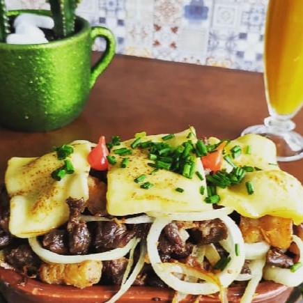 Linguiça calabresa defumada fatiada, refolgada na chapa com cebola, acompanha arroz,feijão e salada
