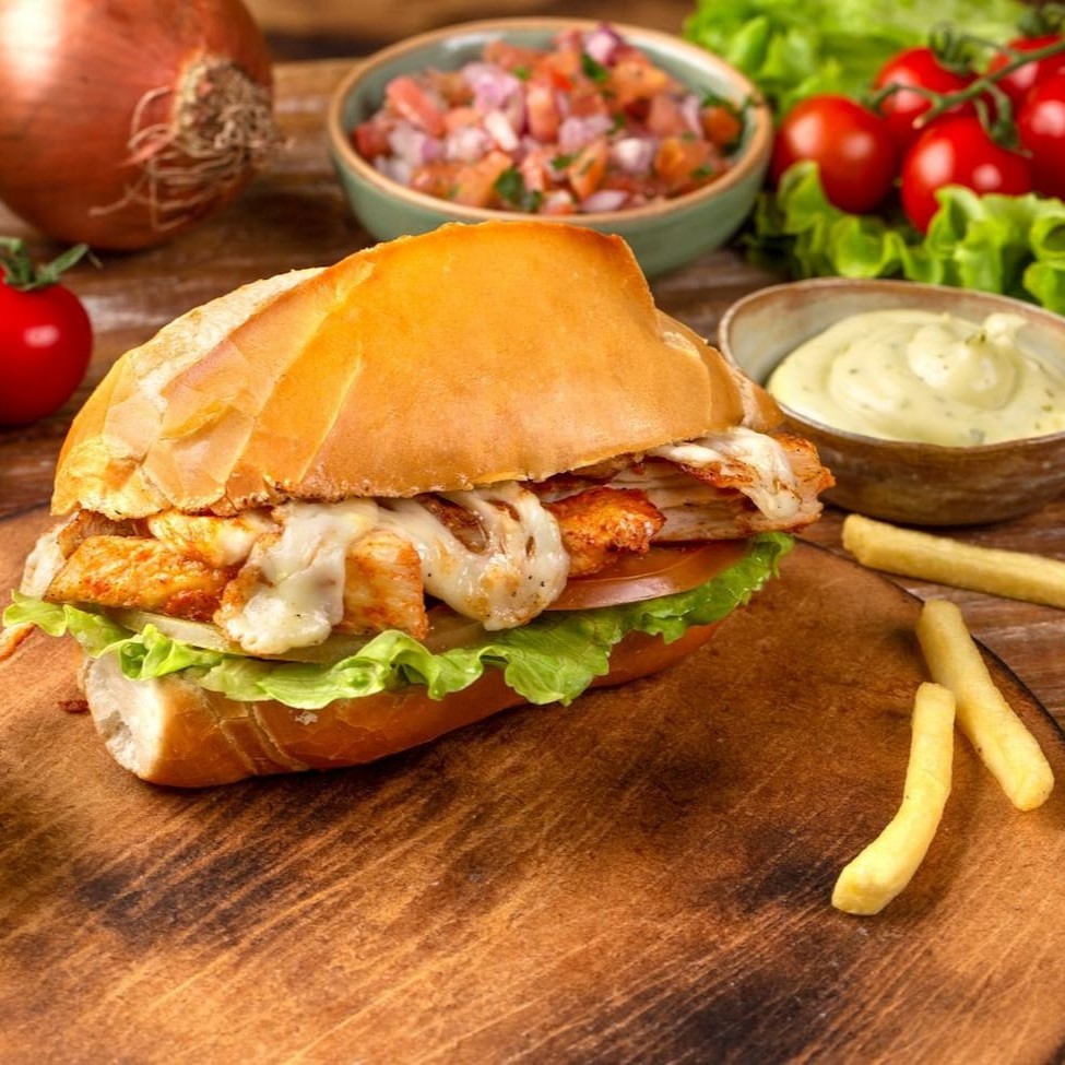 1kg de Frango, Tomate, Alface e Pães.