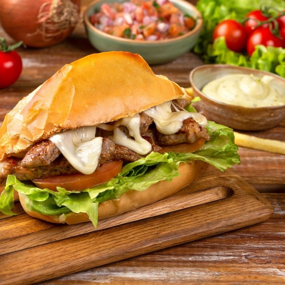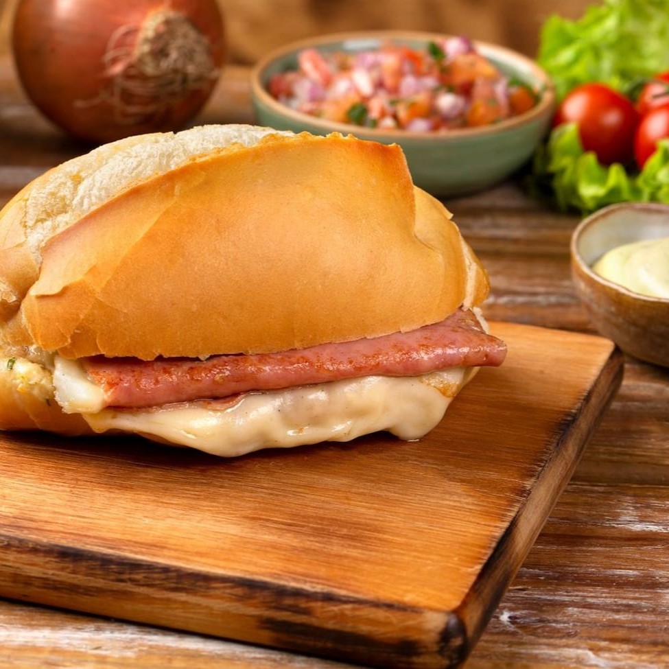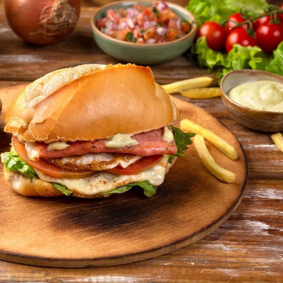 Hambúrguer, queijo, presunto, bacon, ovo, calabresa, frango, maionese e salada.