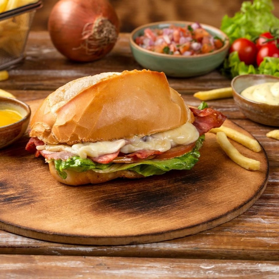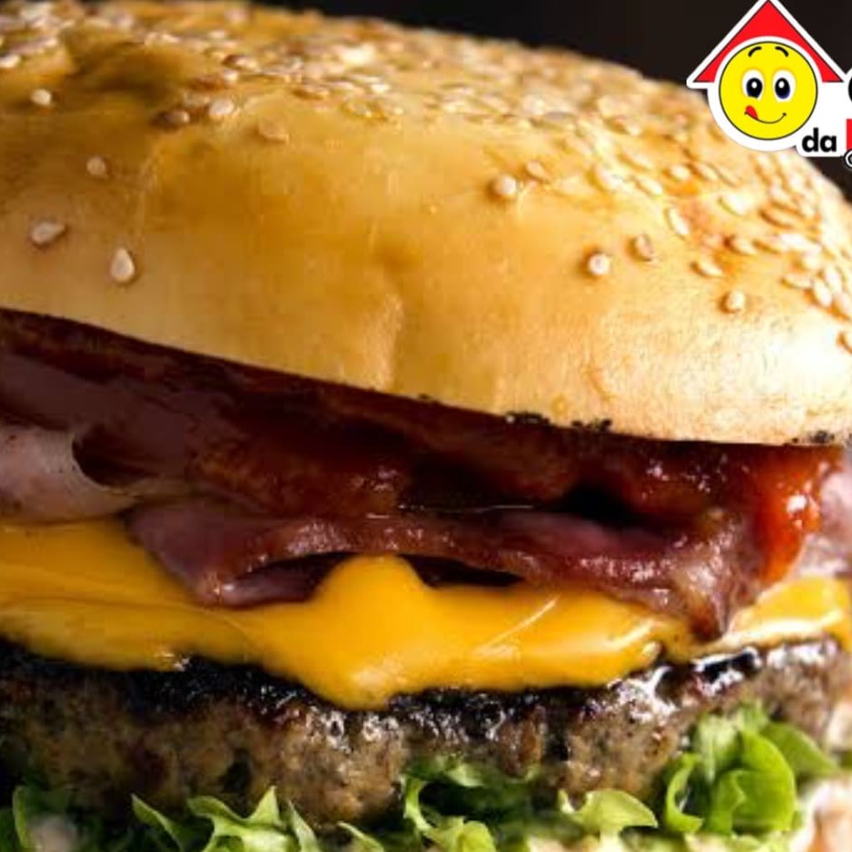 Hambúrguer 120g, bacon, cheddar e maionese.
