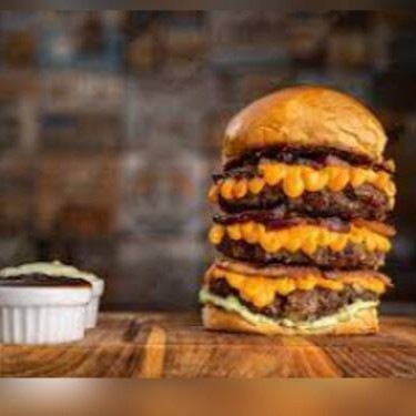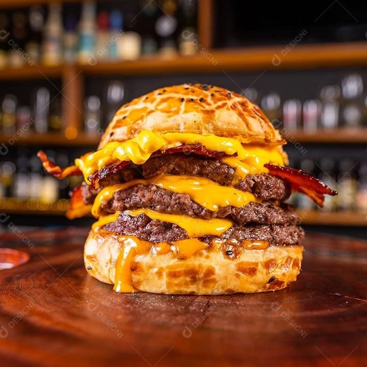Pão Brioche, 3 Hambúrgueres, bacon, cheddar e Maionese.