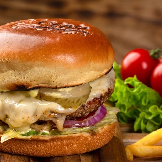 Hambúrguer 120g, queijo e maionese.