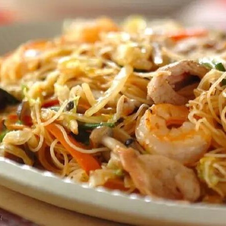 Macarrão de arroz camarão pimentao cebola, cenoura e camarão