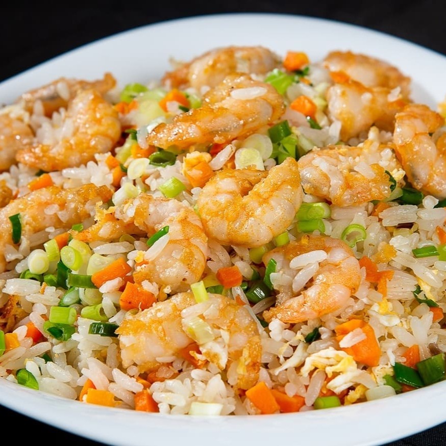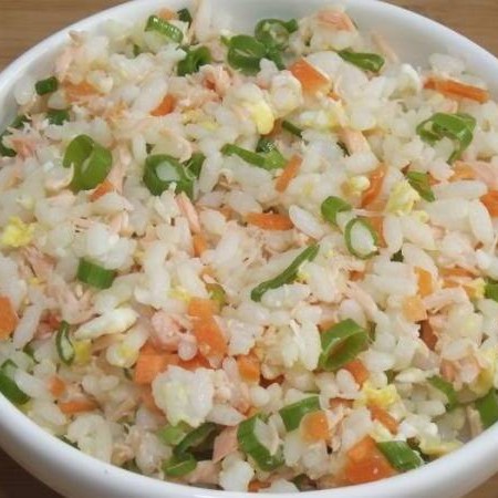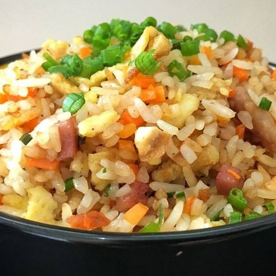 Tradicional risoto chinês com cenoura, presunto, ovo e cebolinha picada.