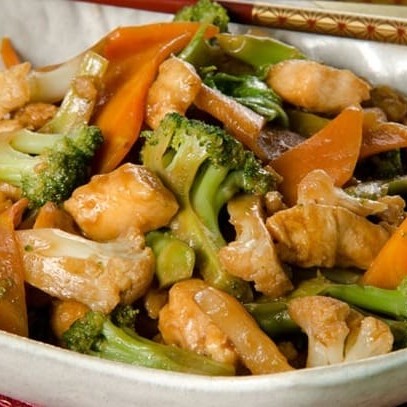 Cubos de peito de frango com pimentão, cebola, cenoura, salsão ao molho shoyu e amendoim