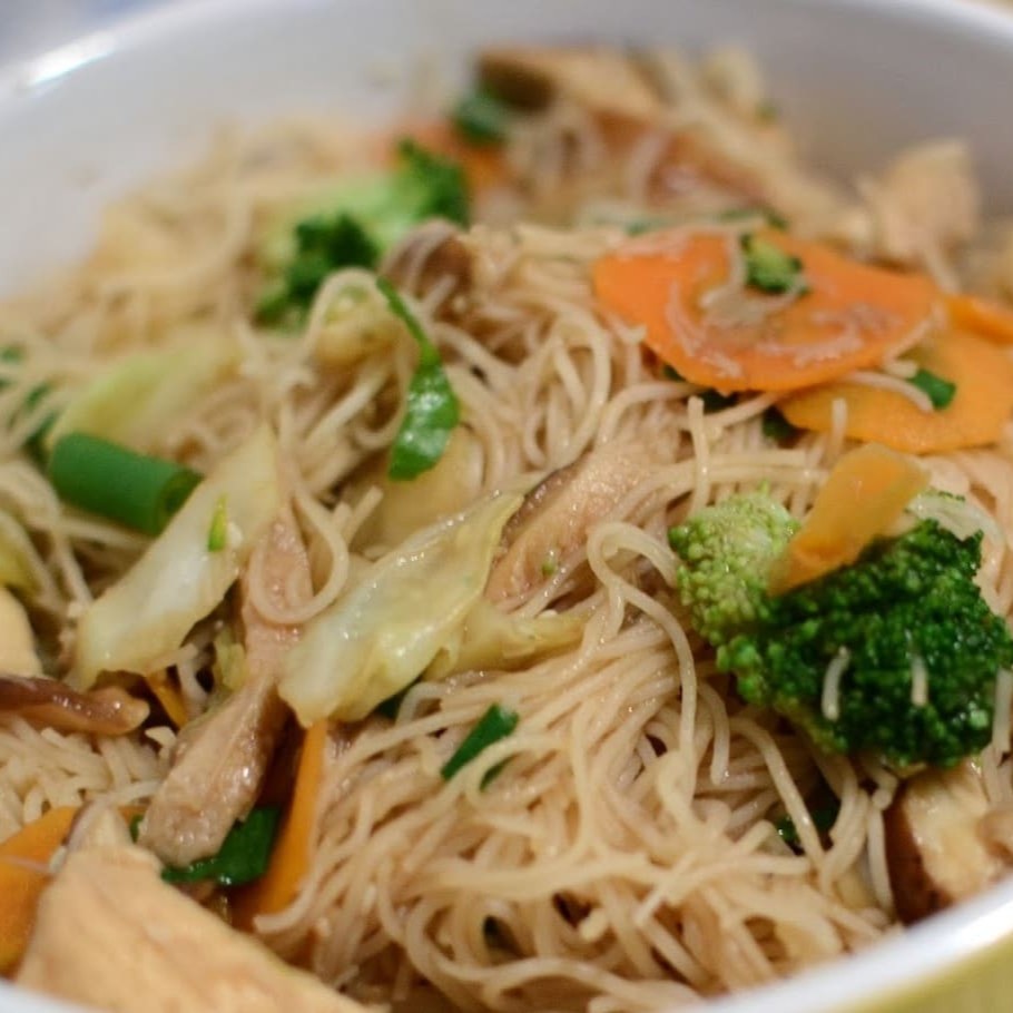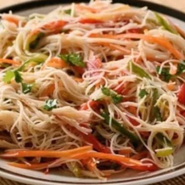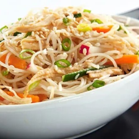 Macarrão de arroz, , frango em tiras moyashi, pimentão, cebola, cenoura e champingnon.