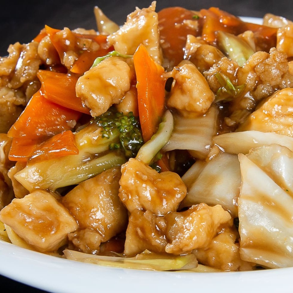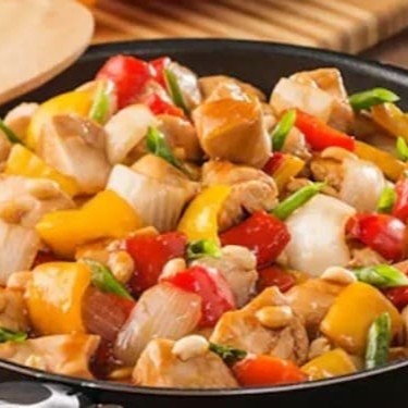 Cubos de peito de frango com pimentão, cebola, cenoura, salsão, camarão, champignon ao molho shoyu e amendoim