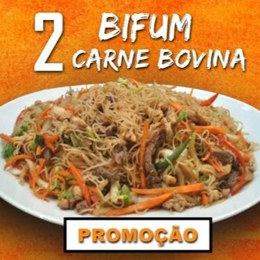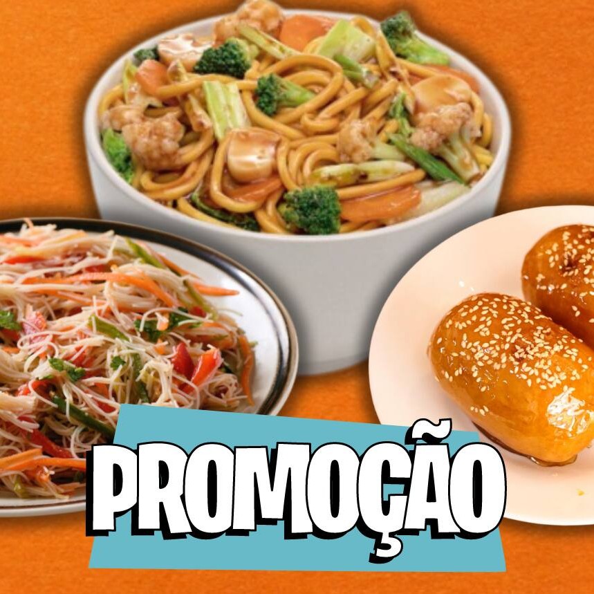1 (Bifum Grande) Macarrão de arroz, , carne bovina em tiras, moyashi, pimentão, cebola, cenoura e champignon 1 (Yakissoba Grande) Saboroso macarrão chinês com carne, frango e legumes selecionados ao molho shoyu. 2 (Banana Caramelizada) Fruta empanada e caramelada, salpicados com semente de gergelim.