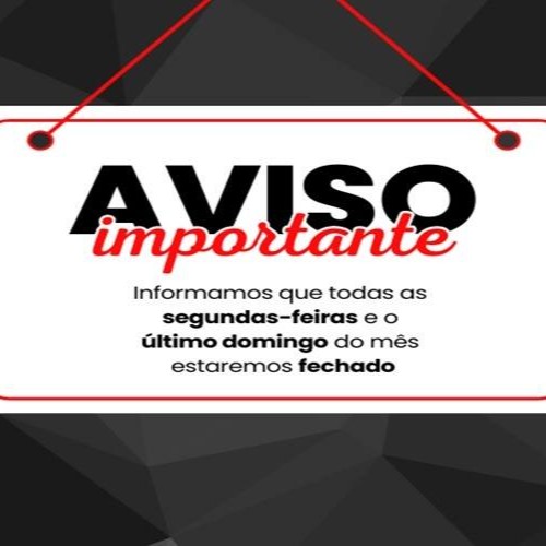 Informamos que todas as segundas-feiras e o último domingo do mês estaremos fechado, Pedimos Desculpa Pelo Transtorno, Obrigado!!