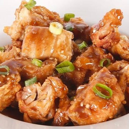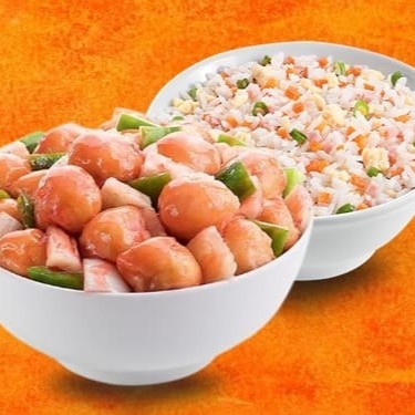 (02 Unidades no tamanho Grande, cada unidade serve 1 Pessoa) 1/2 Porção grande de Pedaços de frango desossados e fritos, salpicados com cebolinha.+ 1/2 porção grande de Arroz Chop-Suey.