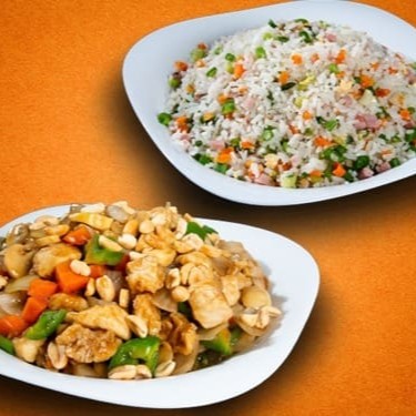 (02 Unidades no tamanho Pequeno, cada unidade serve 1 Pessoa) 1/2 Porção pequena de Frango em cubos com pimentões, cebola e amendoim. + 1/2 Porção pequena de Arroz Chop-Suey.