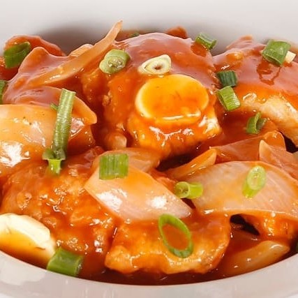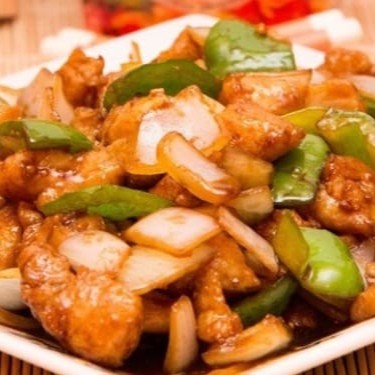 Cubos de peito de frango empanados ao molho agridoce com abacaxi, cebola e pimentão.