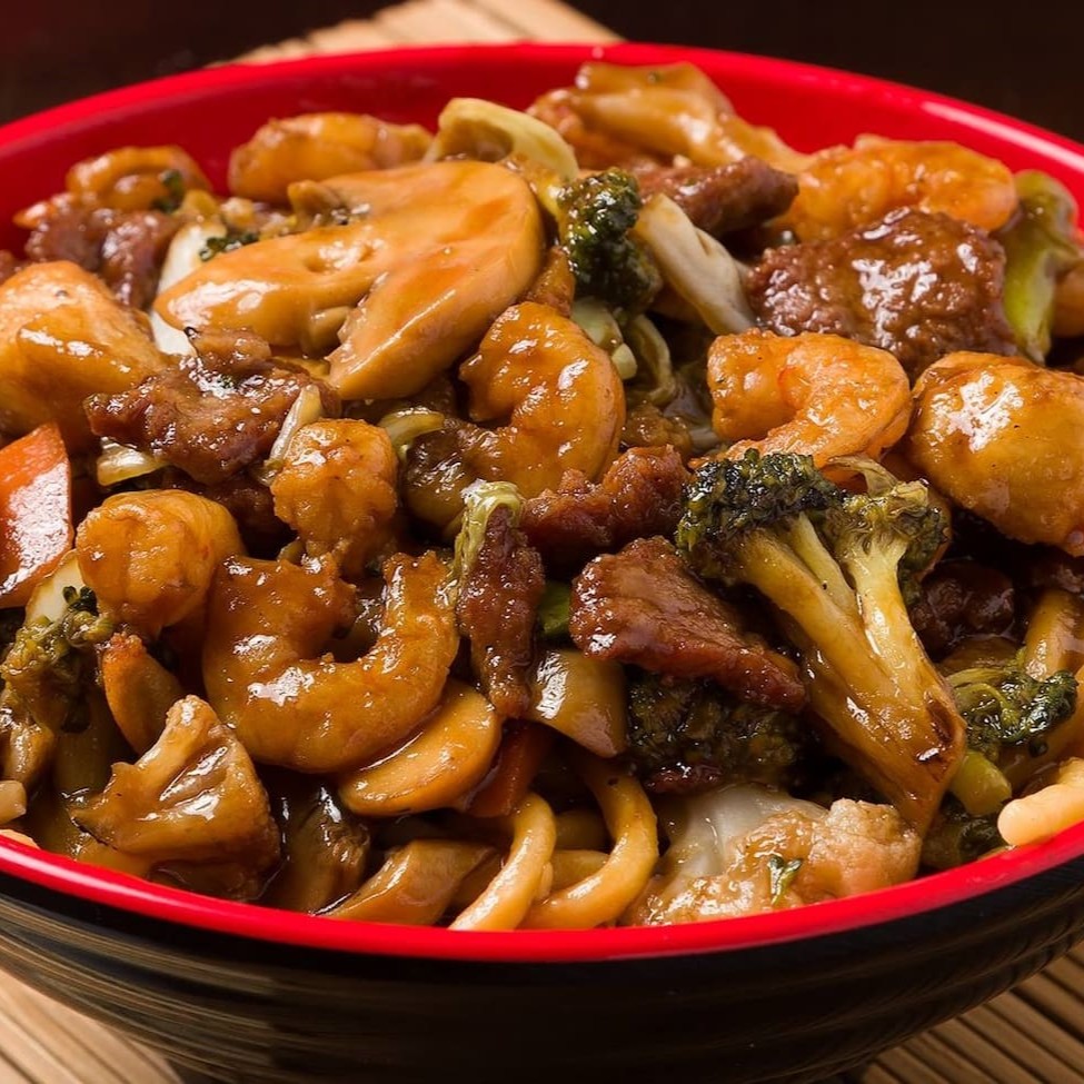 Saboroso macarrão chinês com carne, frango, camarão, ovo de codorna, champignon e legumes selecionados ao molho shoyu.