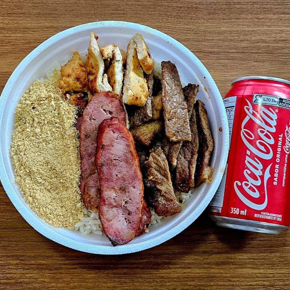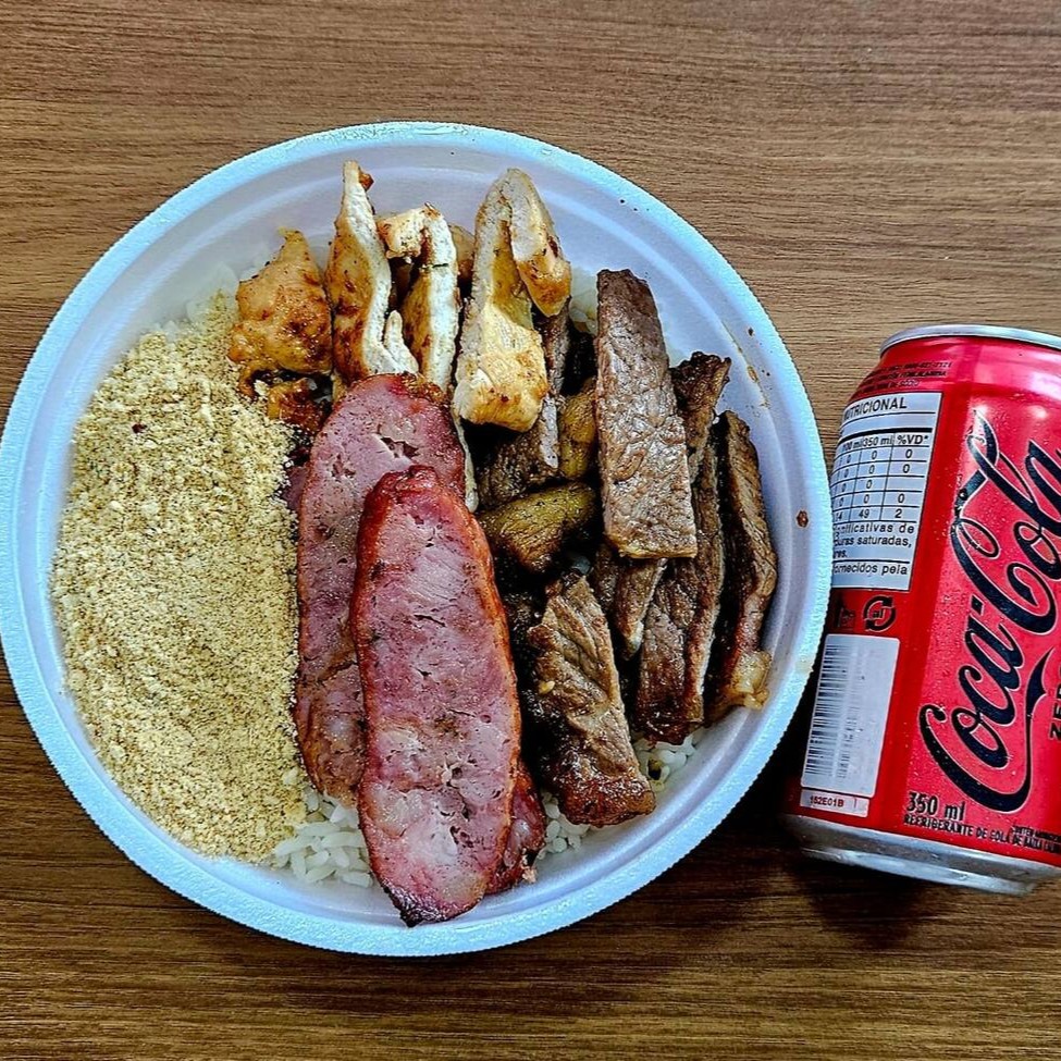 Marmitex Churrasco Misto Acompanha arroz, feijão carioca, tiras de contrafilé, linguiça toscana, filé grelhado e farofa temperada e coca lata zero