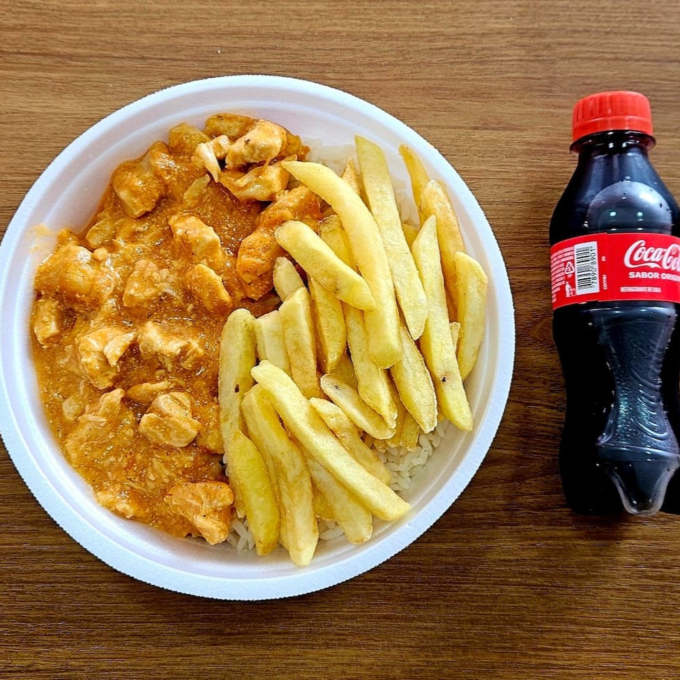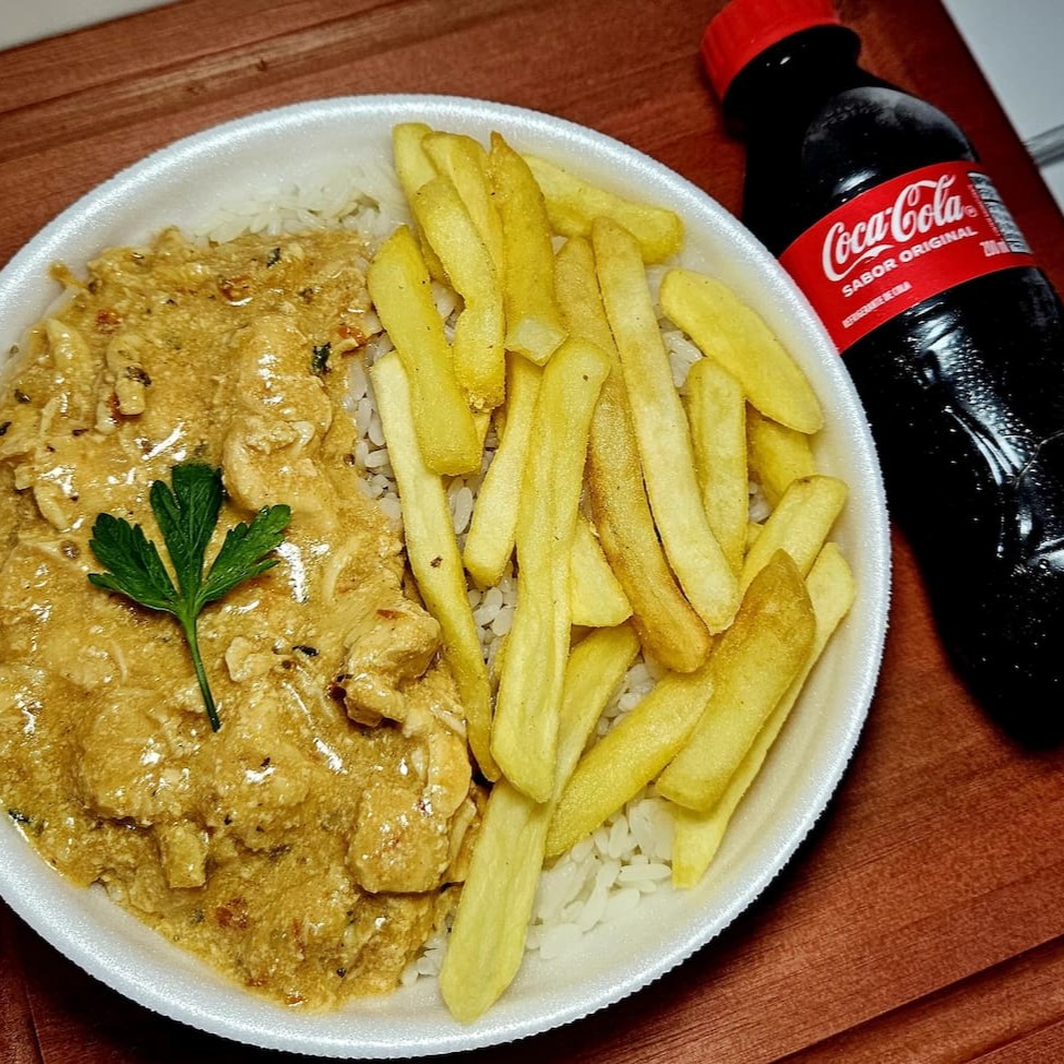 Strogonoff de frango acompanhado de arroz soltinho e batata frita + coca pet Zero