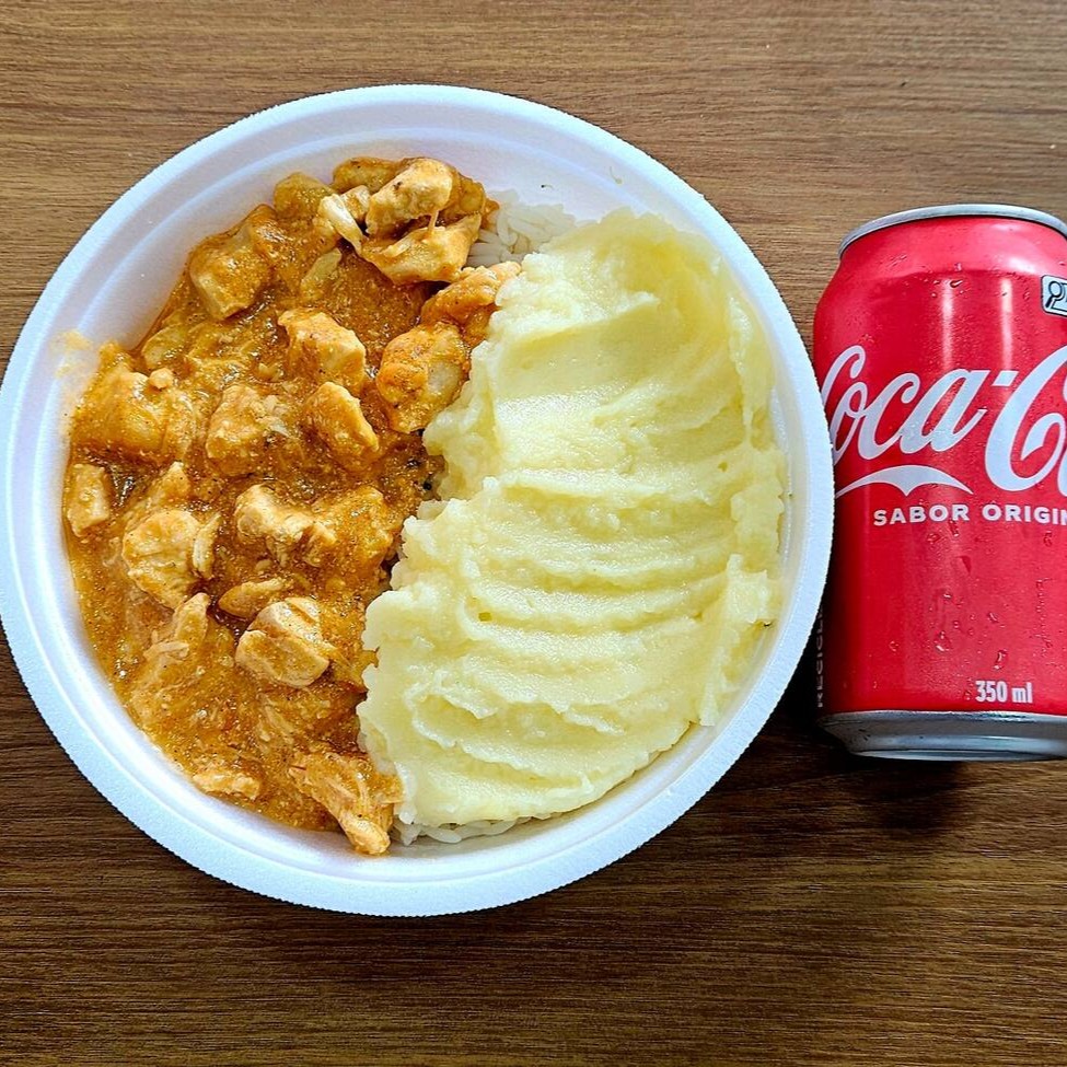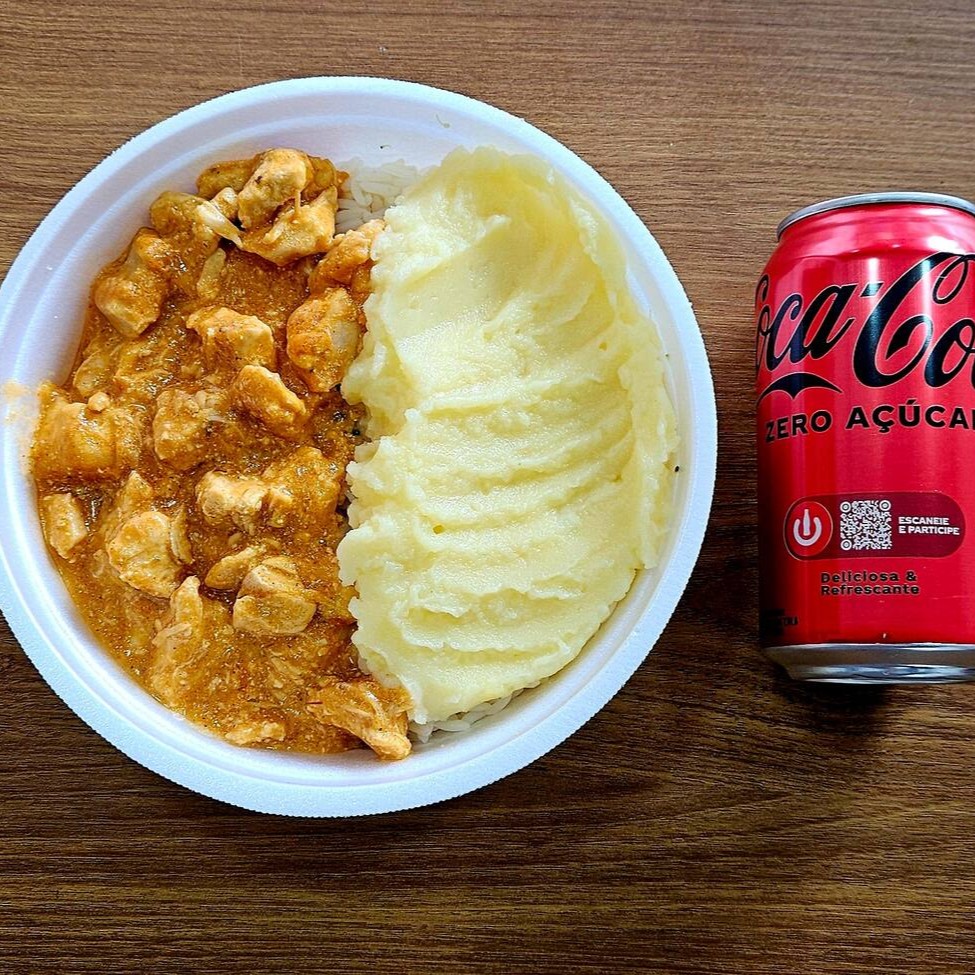 Strogonoff de frango acompanhado de arroz soltinho e purê de batatas caseiro + coca lata zero