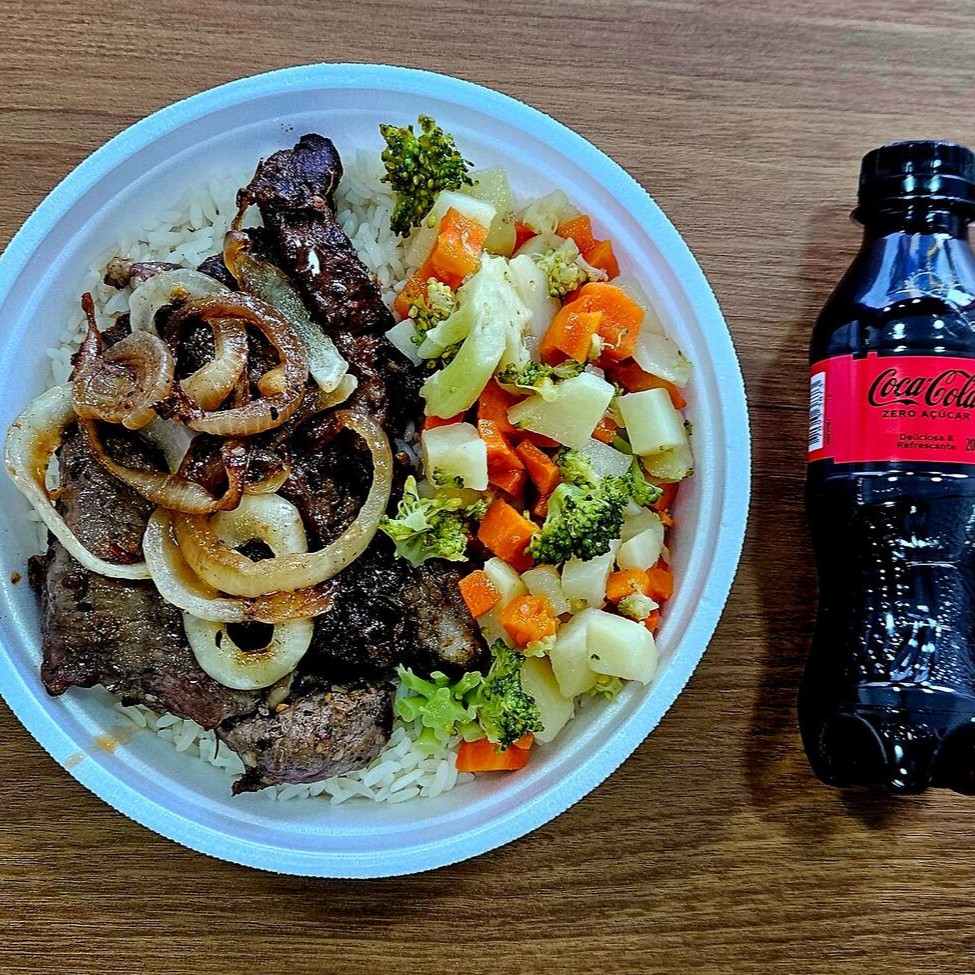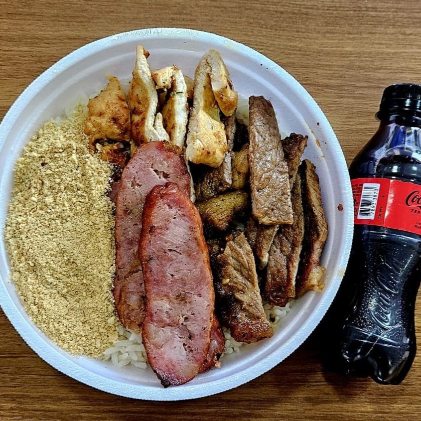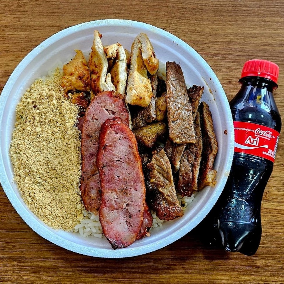 Marmitex Churrasco Misto Acompanha arroz, feijão carioca, tiras de contrafilé, linguiça toscana, filé grelhado e farofa temperada e coca pet zero