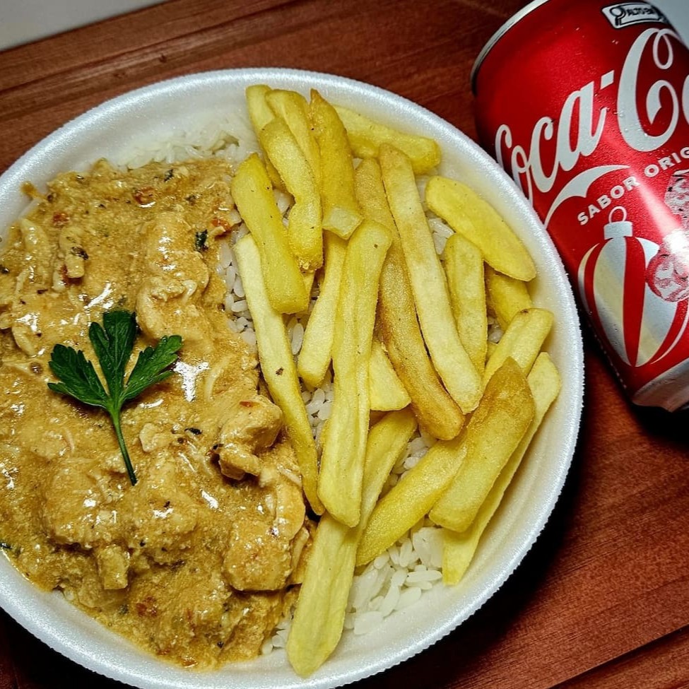 Strogonoff de Frango acompanhado de arroz e batata frita crocante + coca lata Original