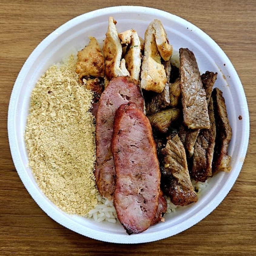 Marmitex Churrasco Misto Acompanha arroz, feijão carioca, tiras de contrafilé, linguiça toscana, filé grelhado e farofa temperada